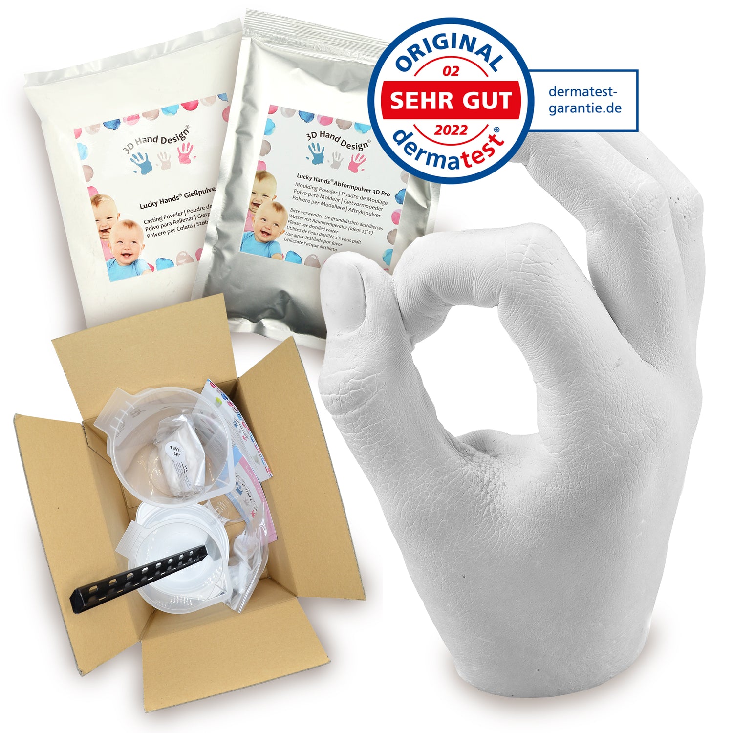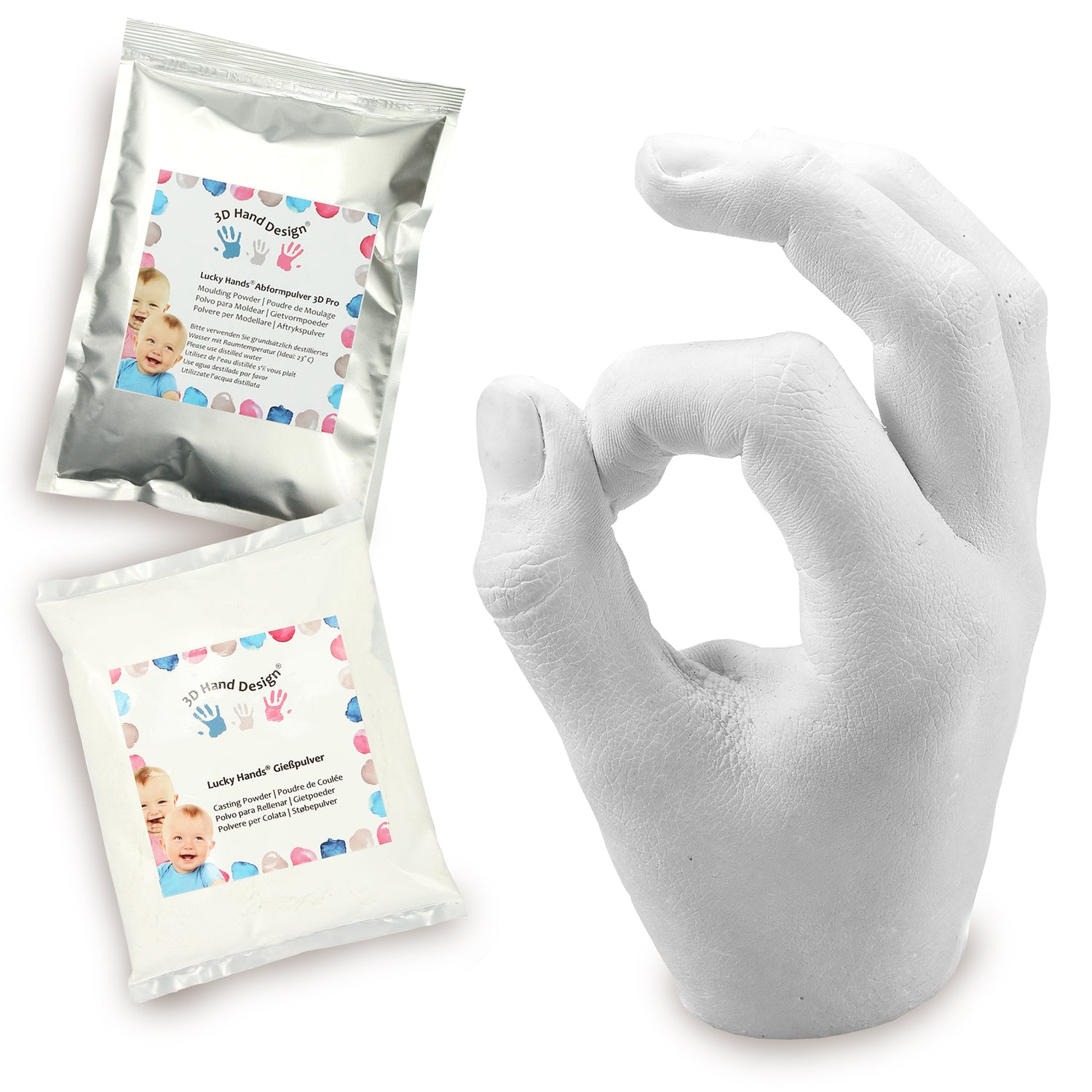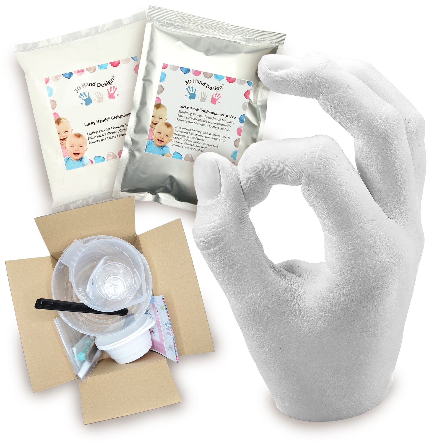 Med våra Lucky Hands®-set får du inte bara våra högkvalitativa material för gjutning och gjutning enligt respektive åldersgrupp, utan även de matchande tillbehören, t.ex. gjutkärl, blandningsmuggar, omrörningsspadar och sandpapper för efterbehandling. På så sätt kan du genast börja ta intryck.